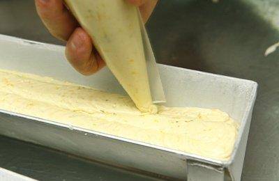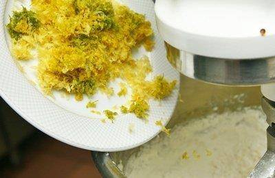 无盐奶油、糖打发至绒毛状,再慢慢加入全蛋继续打发,接着加入低筋面粉、泡打粉、柳橙皮、黄柠檬皮拌匀,做成蛋糕馅。