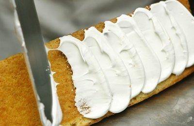 蛋白加糖加温至45~50度,再加入柠檬汁,用电动搅拌机打发作成蛋白霜备用,待蛋糕体冷却后,抹上蛋白霜。
