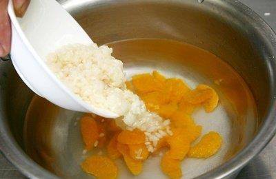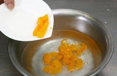 将100~150c.c.的水倒入锅中,加入砂糖和揉碎的橘肉瓣,使味道更鲜明。