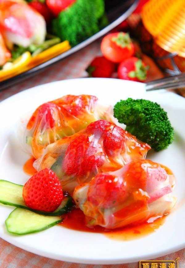 摆盘后将草莓酱、泰式酸辣酱混合拌匀后浇淋在上面即可。