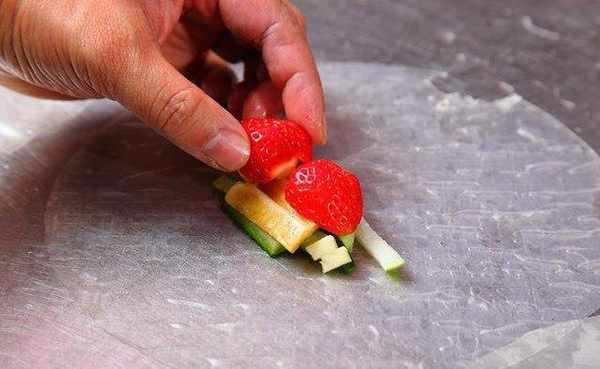 将小黄瓜、苹果、香蕉、枣子等切成长条状的食材铺在粉皮上,最上面摆上草莓,再将粉皮卷起。