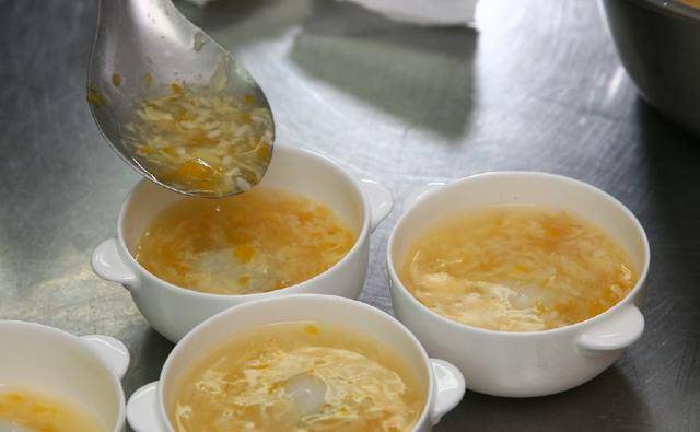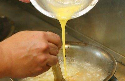 Tips:一定要先勾芡后才下蛋汁,这样蛋花才漂亮,且不会黏稠成一团。