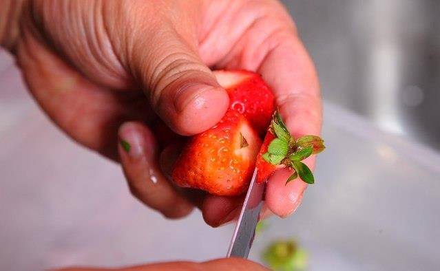 草莓洗净、一一切除蒂头。