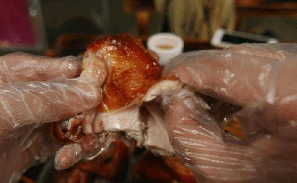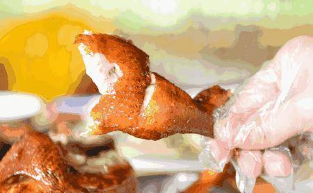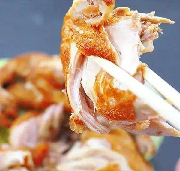 道口烧鸡基本都是散养的鸡,鸡的皮很薄,看上去黄脆,形状像元宝,最大的特点是香味浓郁,脆软,软烂到什么程度?没有刀子,用手轻轻地摇动,鸡和鸡的骨头就会自动分开,甚至鸡皮和鸡肉也很容易分离。老家人喜欢用鸡皮包一小块鸡,放一点洋葱丝,那口感,迷人的味道真的令人难以忘怀。