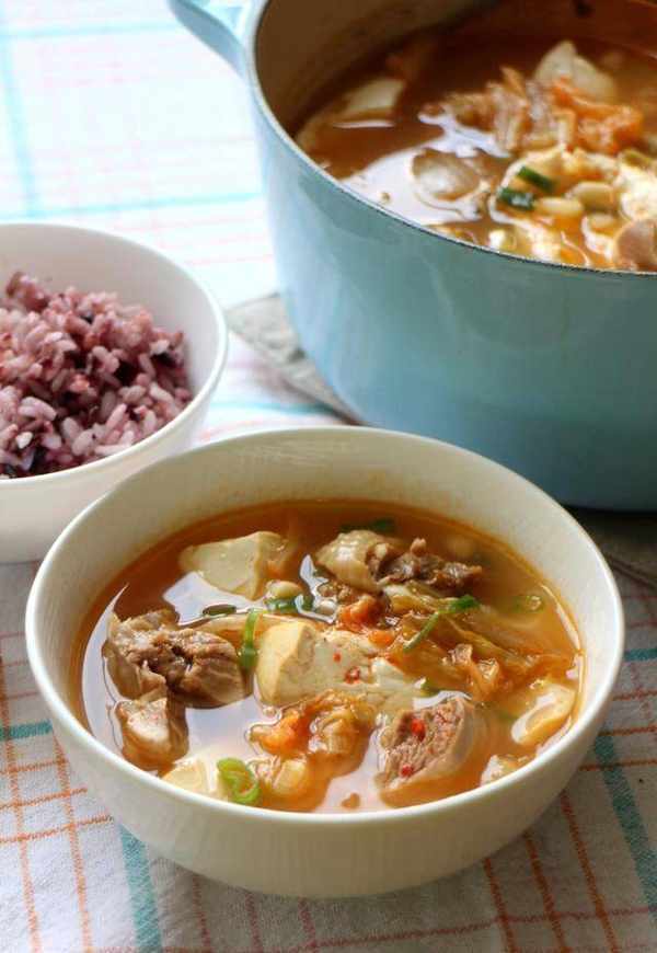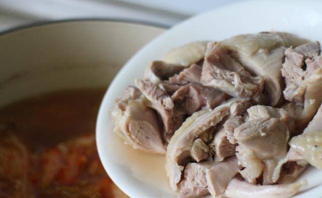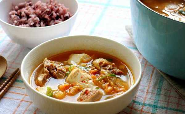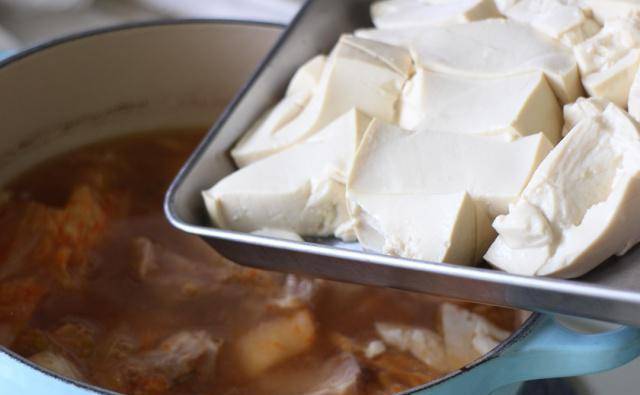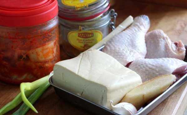 材料:鸡腿、豆腐、泡菜、鳀鱼、大蒜、生姜、青葱、高汤