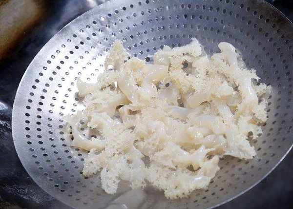 竹笙泡冷水至软化,用手一个个搓洗后,去除头尾的白膜,再切小段备用。