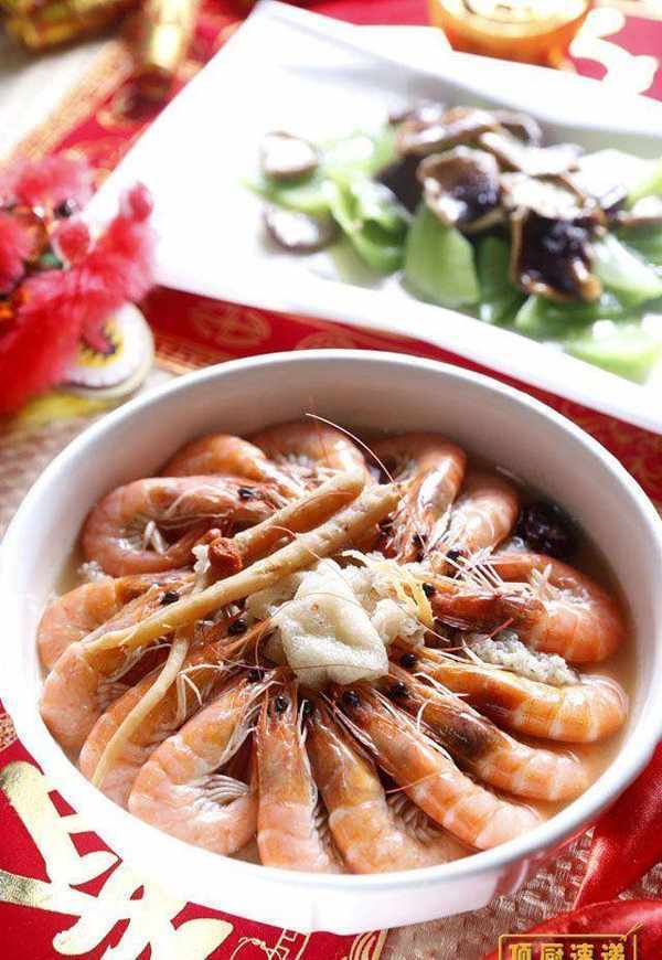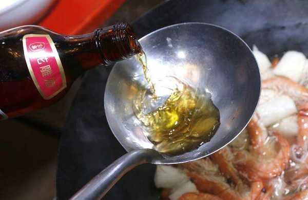 放入竹笙与虾子,用中小火微煮约1分钟。再转中大火后,加入花雕酒、盐、冰糖调味,即完成。