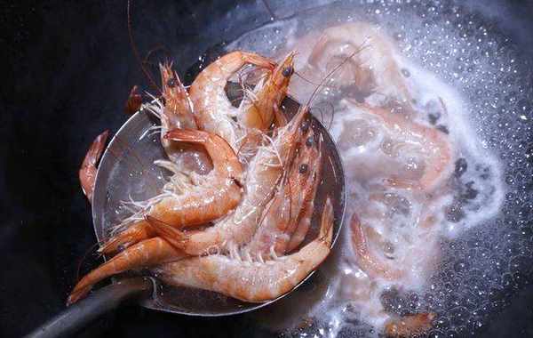 将虾子清洗干净后,放入锅中汆烫至变红,即可捞起备用。