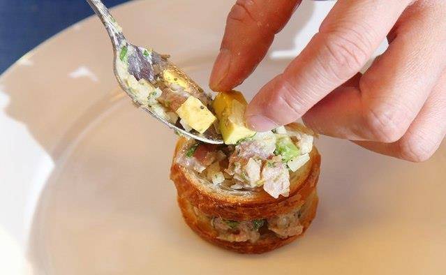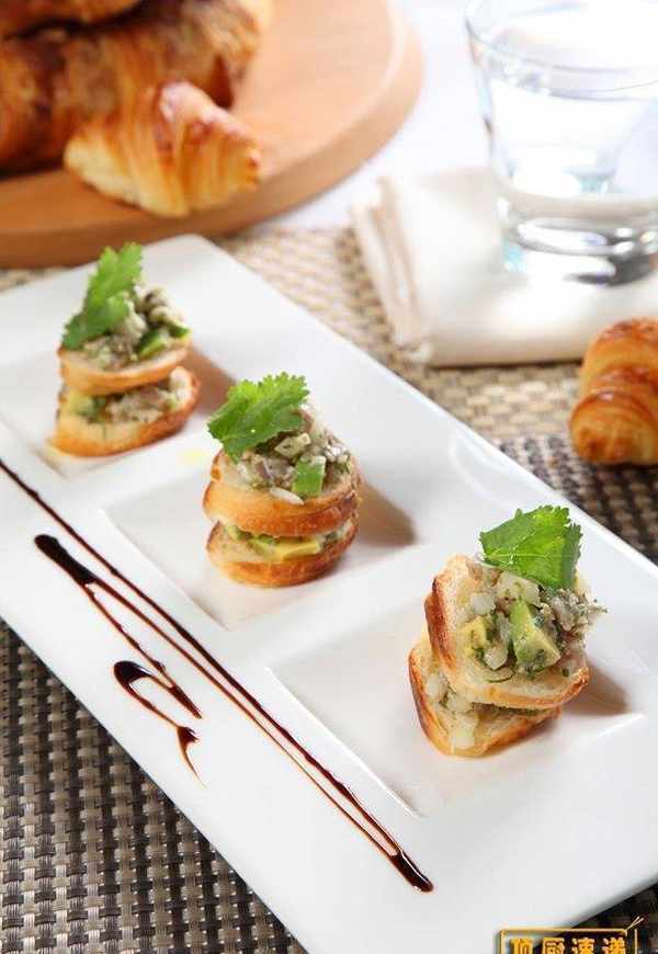 新鲜鲔鱼150g、洋葱30g、酸豆30g、香菜10g、虾夷葱10g、酪梨1颗、小可颂3个、大蒜1g、嫩姜1g、柠檬汁3c.c.