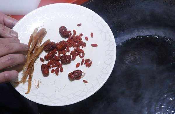 另外准备一干净的锅子,倒入一碗半的水、半碗米酒,并放入参须、红枣、枸杞,以中火煮510分钟。