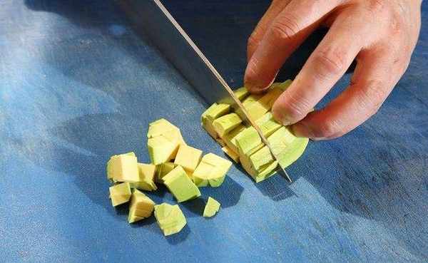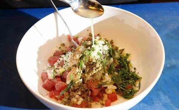 鲔鱼及酪梨切成小丁状、洋葱、酸豆、香菜、虾夷葱、大蒜及嫩姜切碎备用。