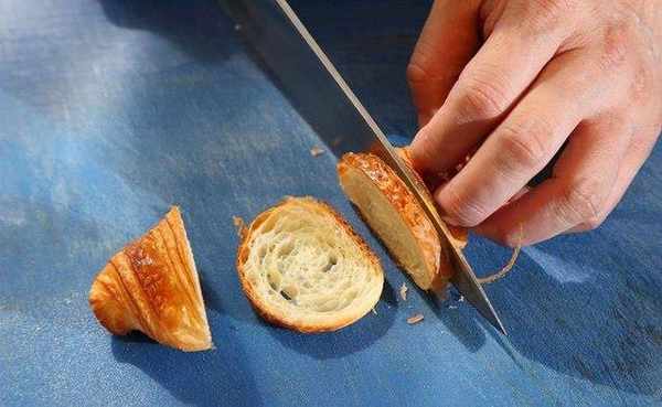 将可颂两边角切除,每个可颂再切成3片,入烤箱以摄氏180度烤约2分钟,备用。