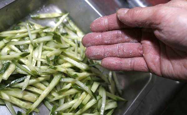 小黄瓜、红萝卜、红甜椒切丝,以少许盐抓腌至出水后挤干水分。