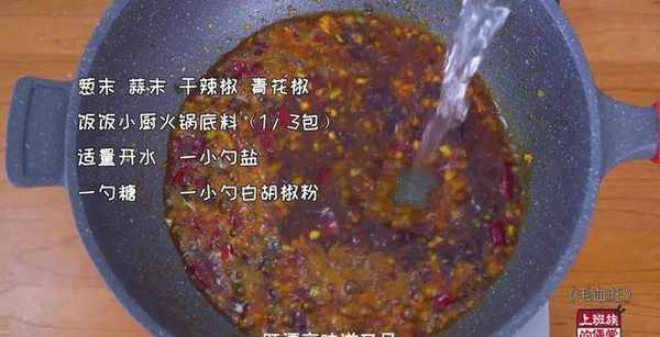 除了煮火锅味道地道又正宗,用来做毛血旺,不需要额外加豆瓣酱啥的,超级香,出来的红油既漂亮味道又足,再倒入小半锅热水,加点盐糖胡椒粉调个味(葱末、蒜末、干辣椒、青花椒、饭饭小厨火锅底料(1/3包)、适量开水、1小勺盐、1勺糖、1小勺白胡椒粉)