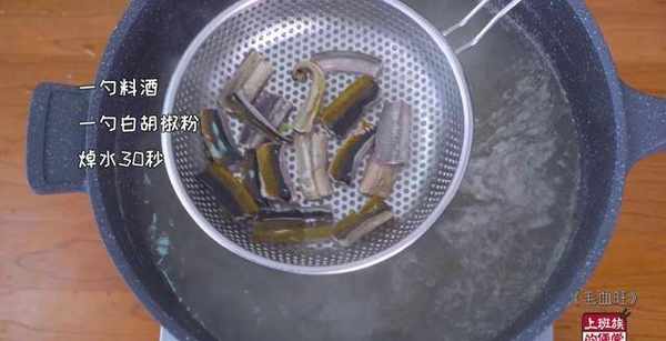 鳝鱼比较腥,还得加点料酒和胡椒粉(1勺料酒、1勺白胡椒粉、焯水30秒)