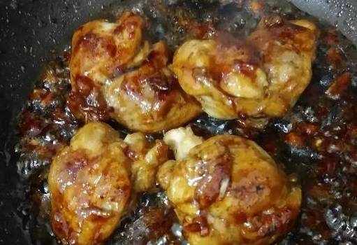 4、然后一直保持中小火收汁就可以啦,加了冰糖的鸡腿肉过一会表面就变得亮晶晶的,很是诱人;