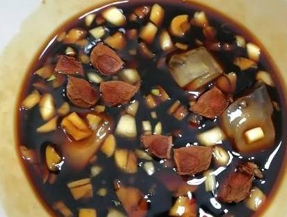 2、然后把蒜切成蒜末,加入蚝油,鲜味酱油,生抽,冰糖,八角,水,调成照烧汁。我用的酱油是鲜酱油,家里有鲜味酱油或者鲜味生抽的话都可以使用,没有的话就用普通酱油。另外,把八角的8个角掰开成小块;