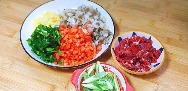 土豆、胡萝卜、青椒、蘑菇切小块装盘待用;牛肉切小块,葱姜切碎装盘