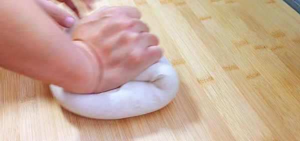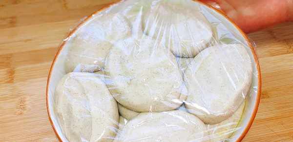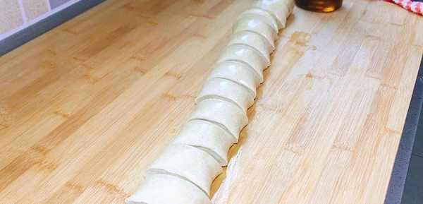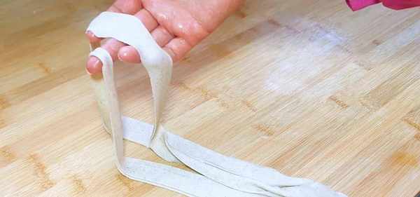 7、面团醒好,取一块木头在醋里擀开,打扁,然后把中间撕开。