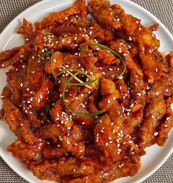 ④锅内留少许油,倒入调好的酱汁,翻炒后加入里脊,翻炒后倒入两勺芝麻,拌匀,起锅