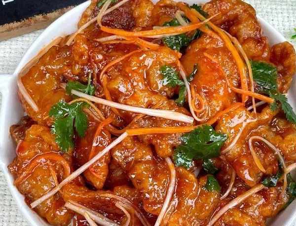 ⑦锅内放少量油。油热后,将洋葱、姜和大蒜炒香。加入足量的番茄酱、糖、少许白醋和生抽调成浓稠的糖醋汁。