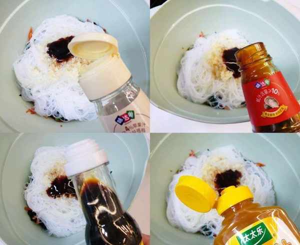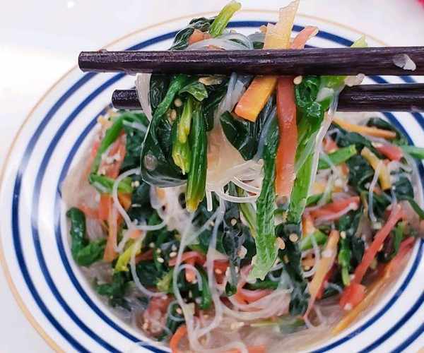 1、菠菜洗净,去根,用淡盐水浸泡10分钟,捞出沥干。将胡萝卜去皮,洗净,切成细条。锅中烧开水,加入粉丝煮2分钟,待其变软后,捞出冷水沥干。