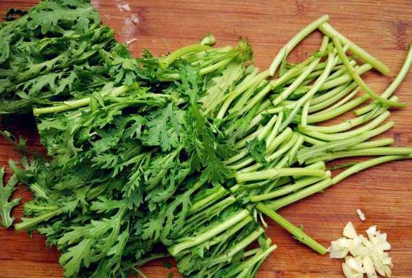 1、菊花采摘洗净,沥干水分,切成长条,将叶和茎分开。用刀背轻敲大蒜瓣,去皮切碎。热锅油烧热,加入蒜末爆香,加入菜茎用大火翻炒1分钟,加入碎叶继续翻炒1分钟。加入适量盐和生抽调味,炸至顺滑,起锅。