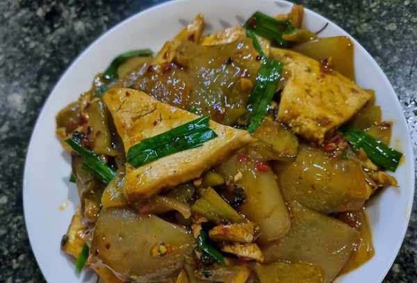 魔芋是纯天然的绿色食品。它看起来又软又粘。吃起来像Q弹,入口即化。它味道独特,营养丰富。它还可以降血压,排毒和滋养皮肤。老豆腐切成三角形,油炸。用切片白兰地炖。只需加一点辣椒和酱油,味道就已经很美味了。为了改善口感,加入一些青蒜,味道会更好。和米饭一起吃味道特别好。