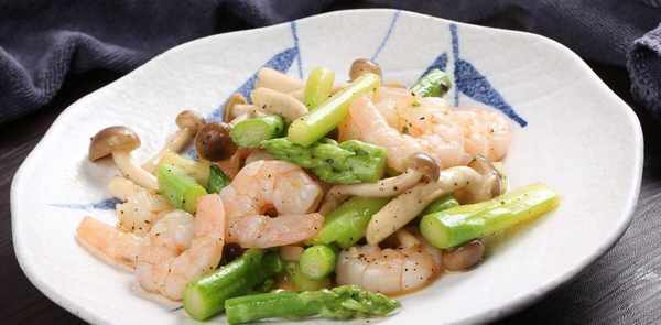 2.将鲜虾洗净,锅中放少许油,油温升高时,下蒜片炒香,放入芦笋和小蘑菇,炒出多余的水,加少许调料。新鲜,胡椒粉和盐,最后加入大虾,炒至大虾变色,大火熄灭。