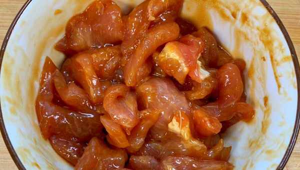 2、接下来准备新鲜的瘦猪肉,先用冷水洗净,然后切成薄片,放入小碗中。首先,将猪肉腌10分钟。油炸后,它会光滑柔软。加入半个蛋清、少许生粉、1茶匙蚝油、半茶匙生抽、香油和盐拌匀。