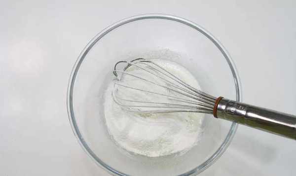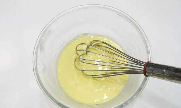 2、准备蛋黄糊:将牛奶、色拉油、砂糖放入打蛋器中,用手动打蛋器搅拌至糖完全溶解乳化;