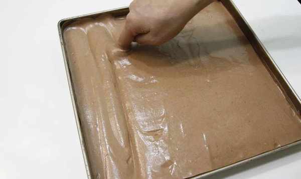 10、画图案:用手指从烤盘的一角插入面团,待底部贴到烤盘底部后,沿左右来回画线,画上一个后移至垂直方向。标记方向并再次重复图片;