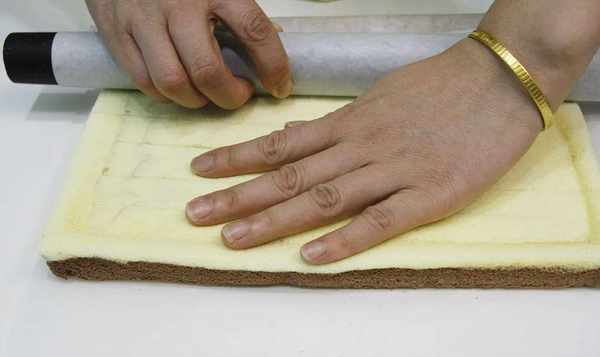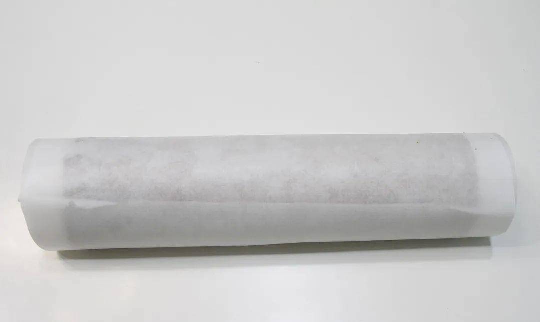14.(填不填看个人喜好)把油纸放在案板上,蛋糕胚底部朝上,用油纸和擀面杖把蛋糕包好,包紧,分成几层。