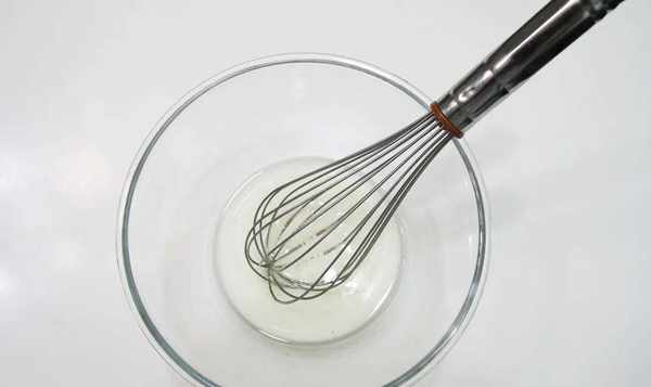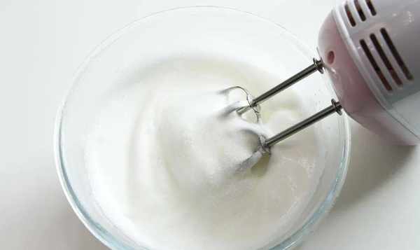 5、蛋白霜打发:蛋清中加入柠檬汁和盐,用打蛋器打至出现粗大泡泡,再加入3粒小糖打至打蛋器弯曲较大;