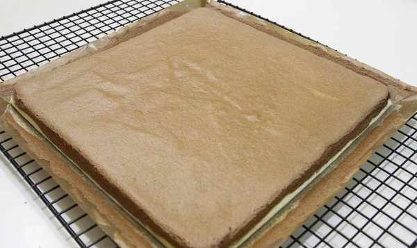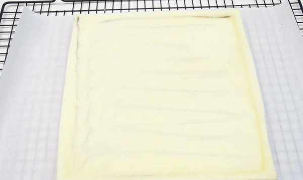 13.烘烤后,将蛋糕卷从烤箱中取出。提起油布,将蛋糕卷从烤盘中取出,放在烤架上。除去周围的油,让它冷却一会儿,直到它变热。在表面铺上防油纸,然后将蛋糕卷擀开。从底部取下油布。然后把蛋糕卷翻过来,表面盖上防油纸,防止水分流失过多,风干;