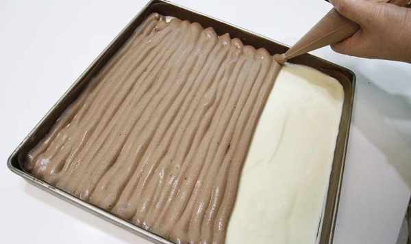 9、在裱花袋上剪一个小洞,快速将可可粉挤在原色面团表面,用刮刀抹平;