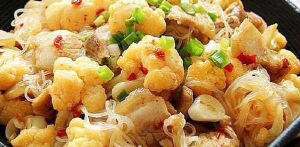 花菜200克,粉丝1小把,五花肉200克,盐油食用油,香葱适量,花椒1汤匙,葱姜末适量,八角1粒,香菜1茶匙料酒、酱油1汤匙、白糖1茶匙、鸡精适量、蒜瓣适量