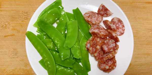 【荷兰豆炒香肠】食材有:荷兰豆、香肠、蒜头、很鲜的味道、糖、鸡汤、盐、食用盐。