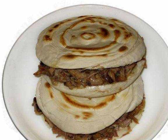 肉夹馍是古汉语“肉夹于馍”的简称,中国陕西省传统特色食物之一。“肉”字放在前面起到强调的作用,引人垂涎。