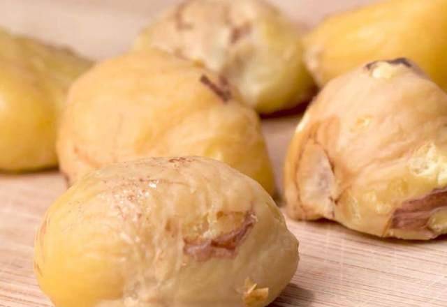 step3:栗子放入滚水中煮5分钟后盛起,趁热剥壳备用。step4:蒜头及干葱下镬爆香,加入排骨煎炒,直至变成金黄色