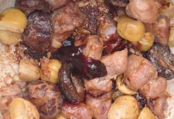 step5:放入冬菇、栗子炒匀,加入调味料。step6:盖上煲盖焖30-45分钟至栗子变臆即成。