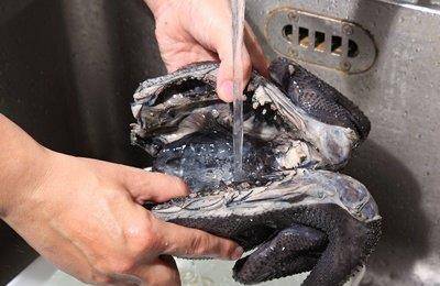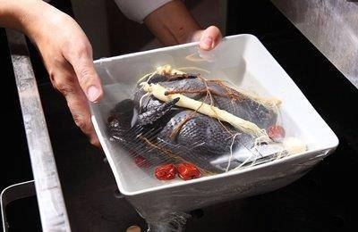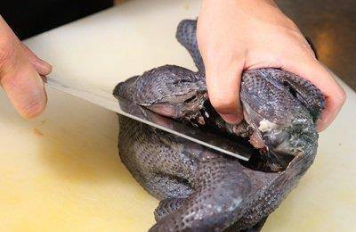 用清水把整只乌骨鸡清洗干净,连鸡只内部的血水也一并洗净。