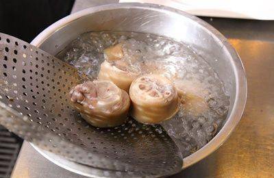 Step2:将汆烫好的猪脚放入冰水中约2分钟,然后洗净备用。Tips:起锅之后的猪脚马上放入冰水浸泡,可以让猪脚皮即使经过炖煮,口感依依旧充满弹性。