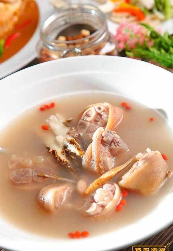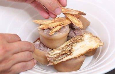 【花生黄芪炖猪脚】食材:猪脚260g、生花生500g、黄芪1g、当归1g、老姜5g、枸杞少许。调味料:米酒300c.c.