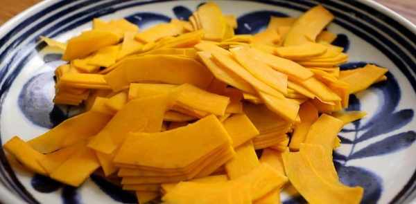 首先,我们要找一个柔软的南瓜,洗净,去皮,切成片,尽量切薄一点,切好后装盘,过一会就可以用了。