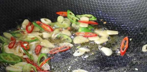 炒香后,加入焯过水的蘑菇,加入切好的青红椒。这时候开大火快速搅拌均匀。炒几分钟,然后炒青椒和红椒直到它们变软。翻炒片刻,然后倒入准备好的酱汁,