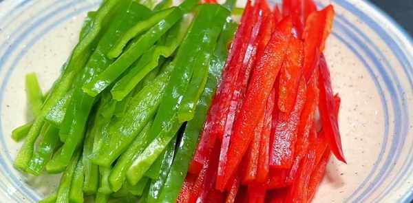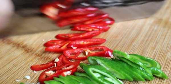 接下来,准备好青椒,用刀切成薄片,准备好红辣椒,也切成薄片,切好装盘。