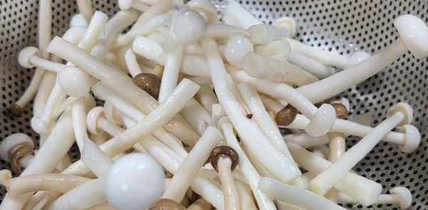 准备白玉菇一把,用刀切根,切好后放入大一点的锅中,再准备一把海鲜菇,连根也切掉。今天我们混合两种蘑菇,它们更有营养。切好后放入大盆中,然后加水,香菇洗净,控水备用。