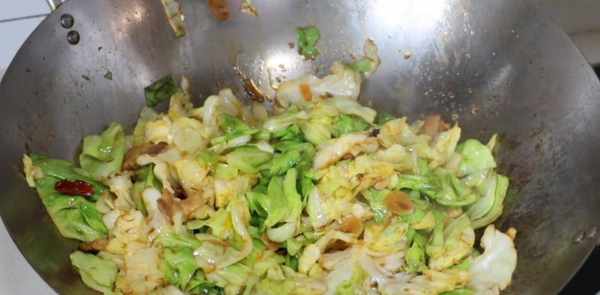 加入切好的葱姜蒜爆香,加少许料酒去腥,加老抽和老抽提香,加少许老抽提香。菜的鲜红色。加入干卷心菜,把火调到最大,搅拌均匀。