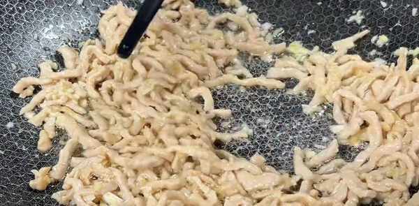 接下来,将锅烧热,加入少许食用油,油稍微热后,将腌制好的肉末放入锅中,用筷子迅速摊开肉末,将肉片炒至变色,放在烤盘上。姜蒜切碎,然后炒香。